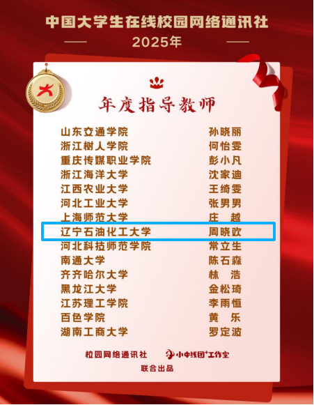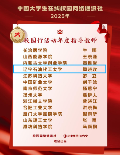 1月8日,教育部中国大学生在线公布了2025年度校园新媒体融合共建表彰名单,学院党总支副书记周晓欢获评2025年度校园新媒体成绩突出个人(教师)荣誉(辽宁省7人)!同时,周晓欢在2025年度教育部中国大学生在线校网通及校园行表彰中,获得“年度指导教师”“校园行活动年度指导教师”两个奖项。