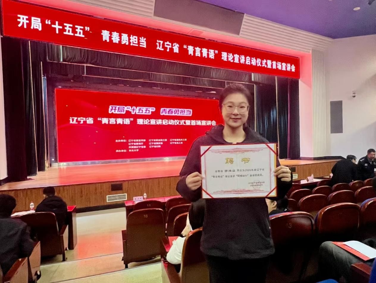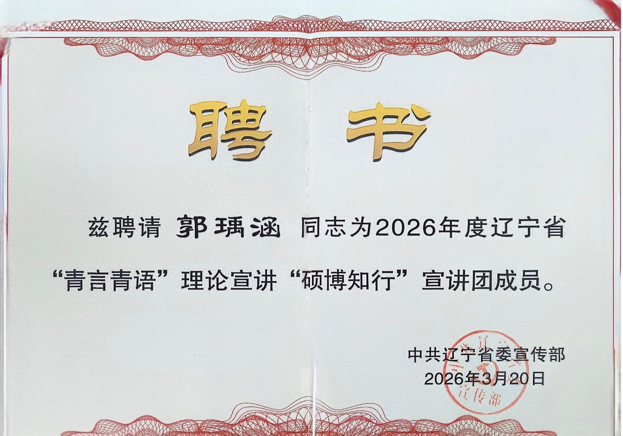 据悉,为更好发挥青年宣讲在凝聚青年思想,激发青年活力,推动社会发展中的重要作用。通过青年讲给青年,青年学习青年,青年影响青年,推动党的创新理论用心践行落地生根,辽宁省委宣传部、辽宁省委金融工委、辽宁省直机关工委、辽宁省教育厅、辽宁省国资委、辽宁省总工会、共青团辽宁省委、辽宁省妇联等八个部门在全省各地各相关系统和领域共同开展“青言青语”理论宣讲工作,辽宁省委宣传部专门组建“青年先锋”“硕博知行”“基层名嘴”三支示范宣讲团。其中“硕博知行”宣讲团面向全省严格遴选,仅招录20名政治立场坚定、具备宣讲经验、说服力与感染力强、拥有校级以上荣誉的硕士博士研究生。我校马克思主义学院研究生“燎原”宣讲团成员郭瑀涵凭借扎实理论素养与突出宣讲能力成功入选,正式受聘为2026年度辽宁省“青言青语”理论宣讲“硕博知行”宣讲团成员。