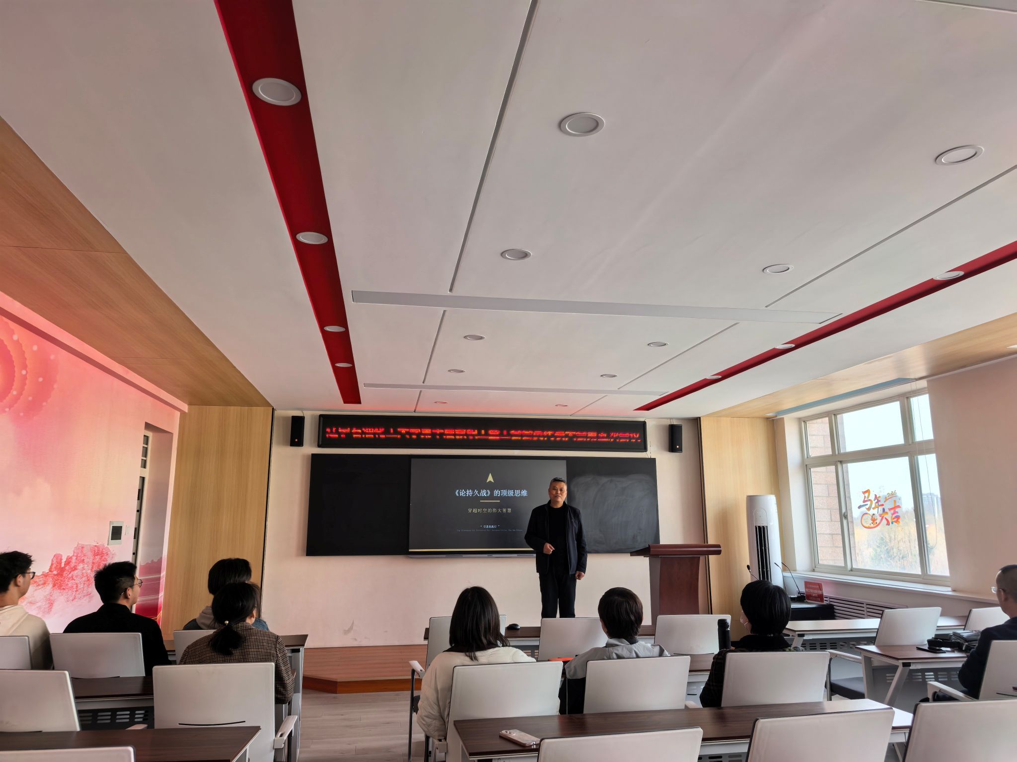 2026年4月1日下午,《毛泽东思想和中国特色社会主义理论体系概论》教研室在马院301会议室成功举办“教师讲原著”系列特色教研活动。本次活动由教研室教师姚鹏担任主讲人,围绕毛泽东经典著作《论持久战》展开深入解读,教研室全体教师参加了本次学习研讨。