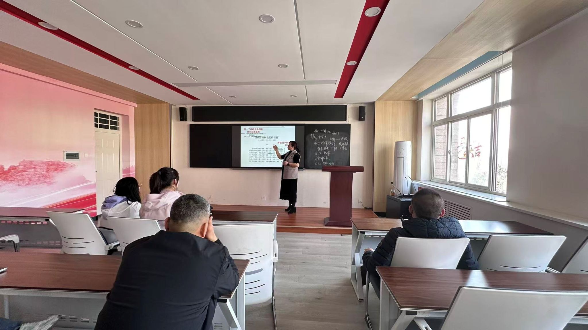 本次教研活动中,邵宏珠老师的讲授展现出深厚的理论功底和扎实的原著积累。她首先梳理了文献的写作背景和历史定位,从军事、土改、整党、经济、统一战线等五个维度系统解析了报告的核心内容,深刻阐释了"十大军事原则""新民主主义三大经济纲领"等重要论断的理论内涵和实践价值。邵老师的讲授内容熟练、逻辑清晰,对历史脉络的梳理环环相扣,对理论观点的分析入木三分,尤其注重结合当代中国特色社会主义建设的实际,揭示经典著作跨越时空的当代价值,为现场教师带来了一场兼具理论深度和现实温度的思想盛宴。多位青年教师表示,邵老师的讲授打通了历史与现实的理论脉络,让大家对经典著作的理解从"字面认知"上升到"本质把握"。