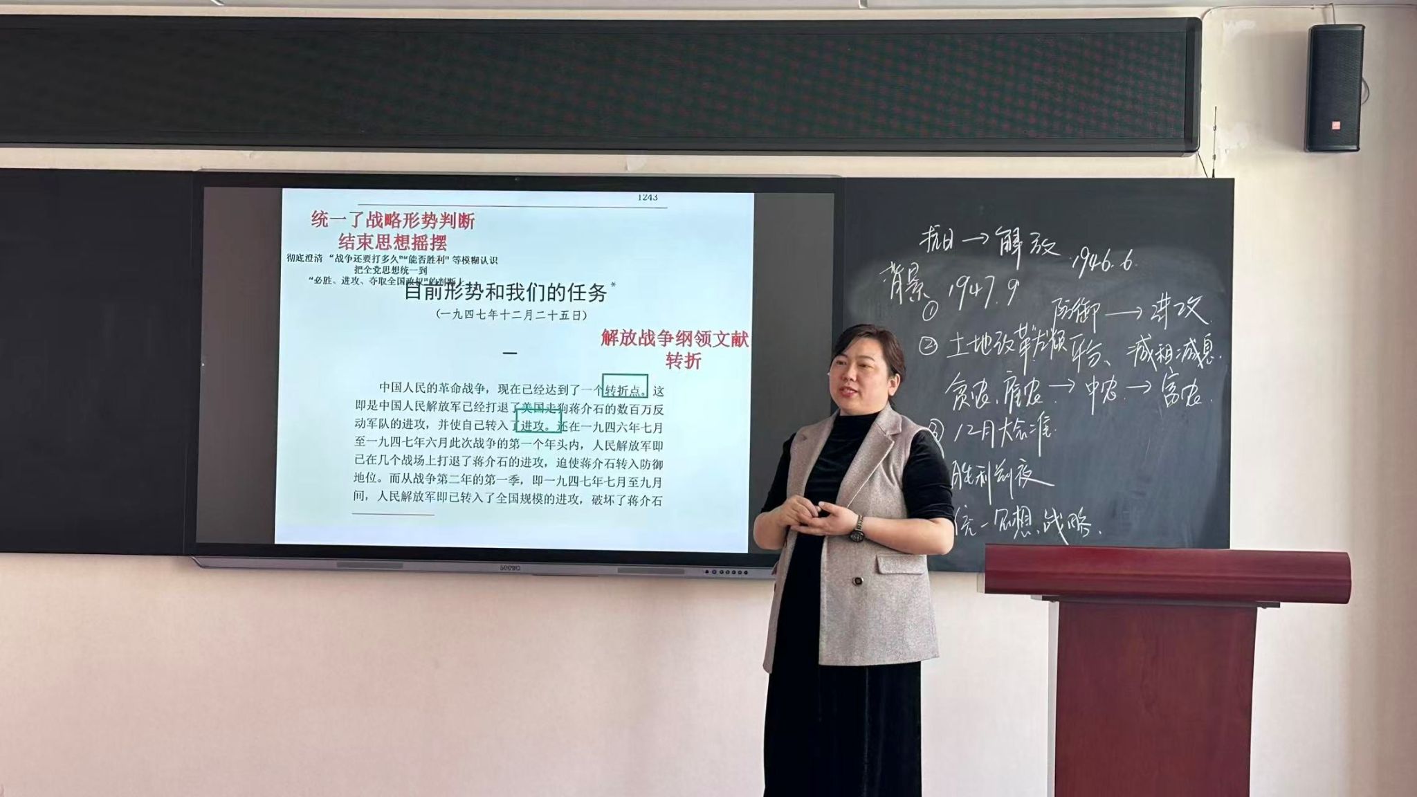 互动环节是本次教研活动的突出亮点。为提升教研实效,教研室特别邀请了2名学生督导官全程参与活动,从学生视角对教师的讲授内容和方式提出反馈建议。邵宏珠老师在讲授过程中主动设置多个互动议题,引导在场教师和学生督导官围绕"农村阶级分析""解放战争的战略转折"等问题展开讨论,现场教师与学生展开热烈交流,思想碰撞频频产生火花。这种"师生双向互动"的教研模式,打破了传统教研活动"教师自说自话"的局限,让教研成果更贴合学生实际需求,有效提升了讲授效果。