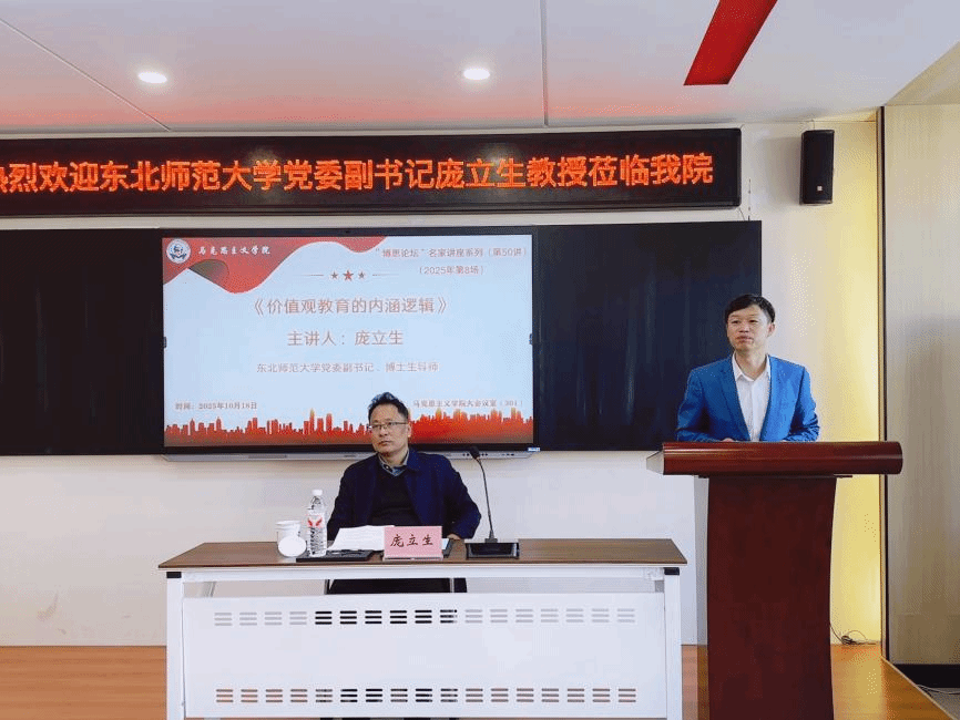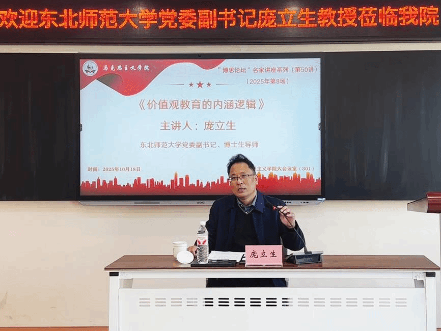 讲座伊始,院长刘志丹致辞。首先他对庞立生教授的到来表示热烈欢迎与诚挚的感谢,高度肯定其在马克思主义理论与价值观教育领域的深厚造诣。他认为,价值观教育是思政教育的核心内容,关乎学生精神成长与社会价值导向,希望此次讲座助力与会师生深化对价值观教育本质的理解,为后续教学与研究提供新思路。