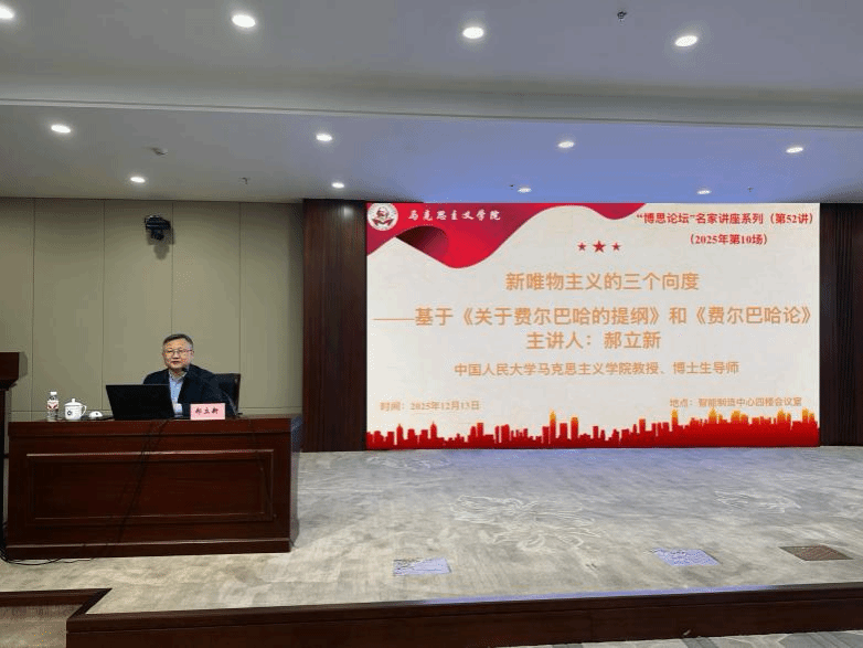 12月13日上午,教育部重大人才项目特聘教授,国务院学位委员会学科评议组成员,中央马克思主义理论研究和建设工程首席专家,中国人民大学原校长助理,马克思主义学院教授、博士生导师郝立新应邀莅临我校,在智创中心大楼414作题为《新唯物主义的三个维度一一基于<关于费尔巴哈的提纲>和<费尔巴哈论>》的学术报告,本次讲座由马克思主义学院和辽宁省高校思想政治理论课名师工作室联合举办,系“博思论坛”名家讲座系列第52场(2025年第10场)。与会人员包括马克思主义学院党总支书记刘淑艳、院长刘志丹、副院长闫义夫以及90余名师生代表。本次讲座由刘志丹主持。