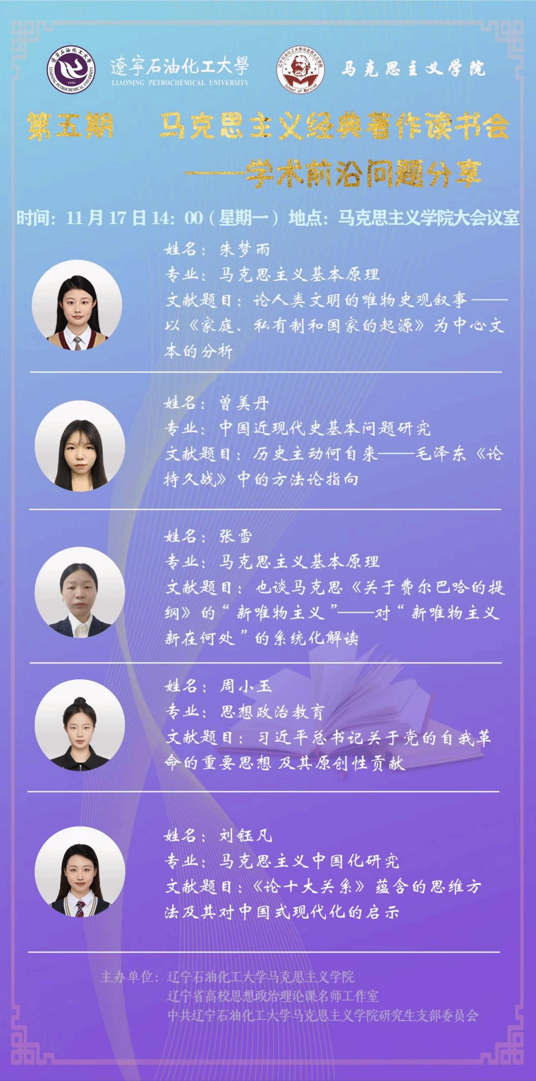 为深入研读马克思主义经典文献,加强学科素养,促进青年学子学术交流与思想碰撞,马克思主义学院于11月17日在学院第一会议室举办2025-2026学年第六期青年学术读书会。活动由2024级研究生张骁主持,特邀马克思主义学院副教授王旭东任评委,2025级全体研究生及部分2023级、2024级研究生参会。