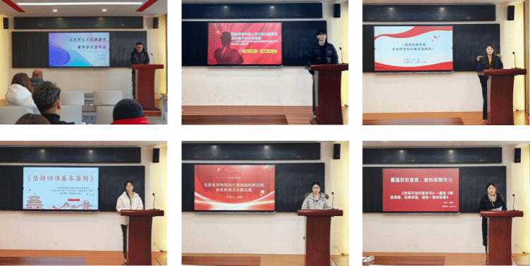 活动开始,五位主讲同学依次进行主题分享。吴祎杰聚焦党“以人民为中心” 的执政逻辑,阐释团结带领人民奋斗的价值意蕴;赵一晗立足底线思维,探讨防范化解风险挑战的理论基础与实践要求;倪欣蕾解读四项基本原则的发展演变,分析新时代“四个坚持”的内涵与意义;杨芮围绕毛泽东对传统知行观的创造性转化,梳理其理论脉络与实践启示;郑麒静重温邓小平《解放思想,实事求是,团结一致向前看》讲话,剖析解放思想、实事求是等核心要旨的时代价值。
