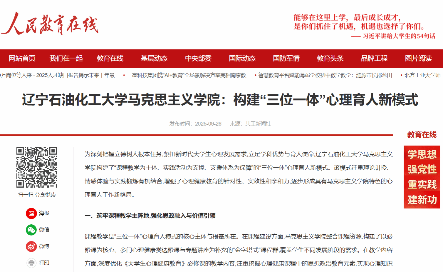 编者按:近日,人民教育在线、中华网、中国晨报网等媒体平台对我校李香凝老师撰写的文章《辽宁石油化工大学马克思主义学院:构建“三位一体”心理育人新模式》进行了宣传报道。现将相关报道转载如下: