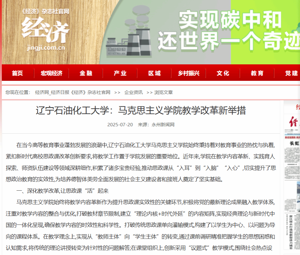 编者按:近日,中国网、经济网(《经济日报》经济杂志社官网)、改革网、中华网等媒体平台对我校付晓倩老师撰写的理论文章《辽宁石油化工大学:马克思主义学院教学改革新举措》进行了转载报道。现将相关报道转载如下: