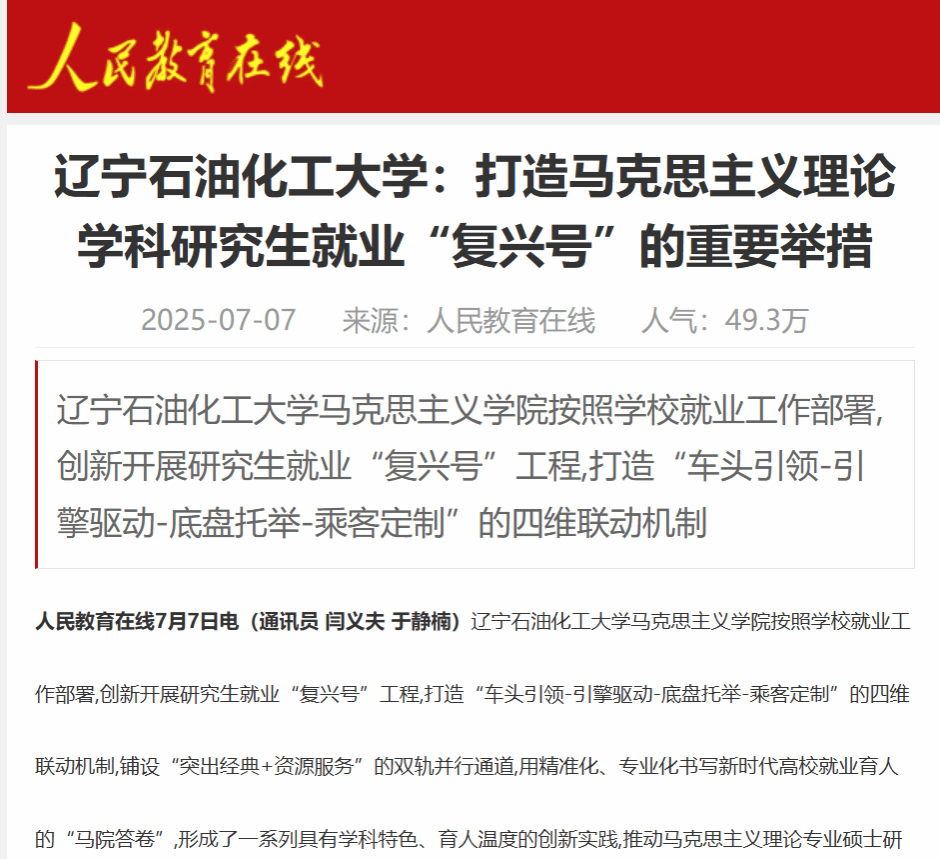 编者按:近日,人民教育在线(客户端)、中国企业报官网、中国工业新闻网、中华网等媒体平台对我校闫义夫老师撰写的理论文章《辽宁石油化工大学:打造马克思主义理论学科研究生就业“复兴号”的重要举措》进行了转载报道。现将相关报道转载如下: